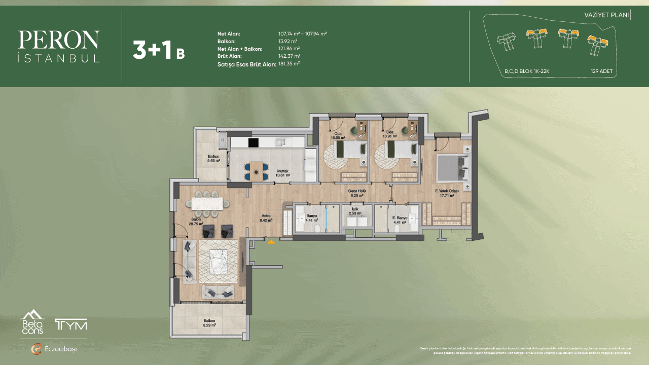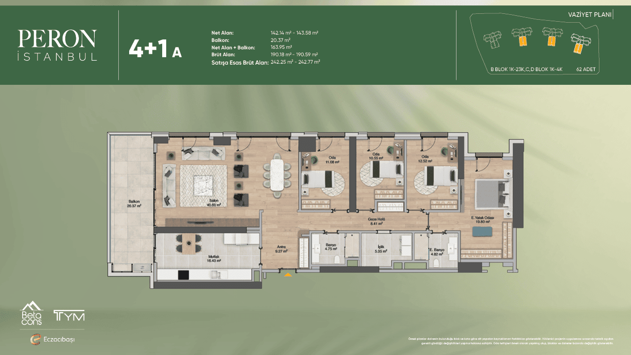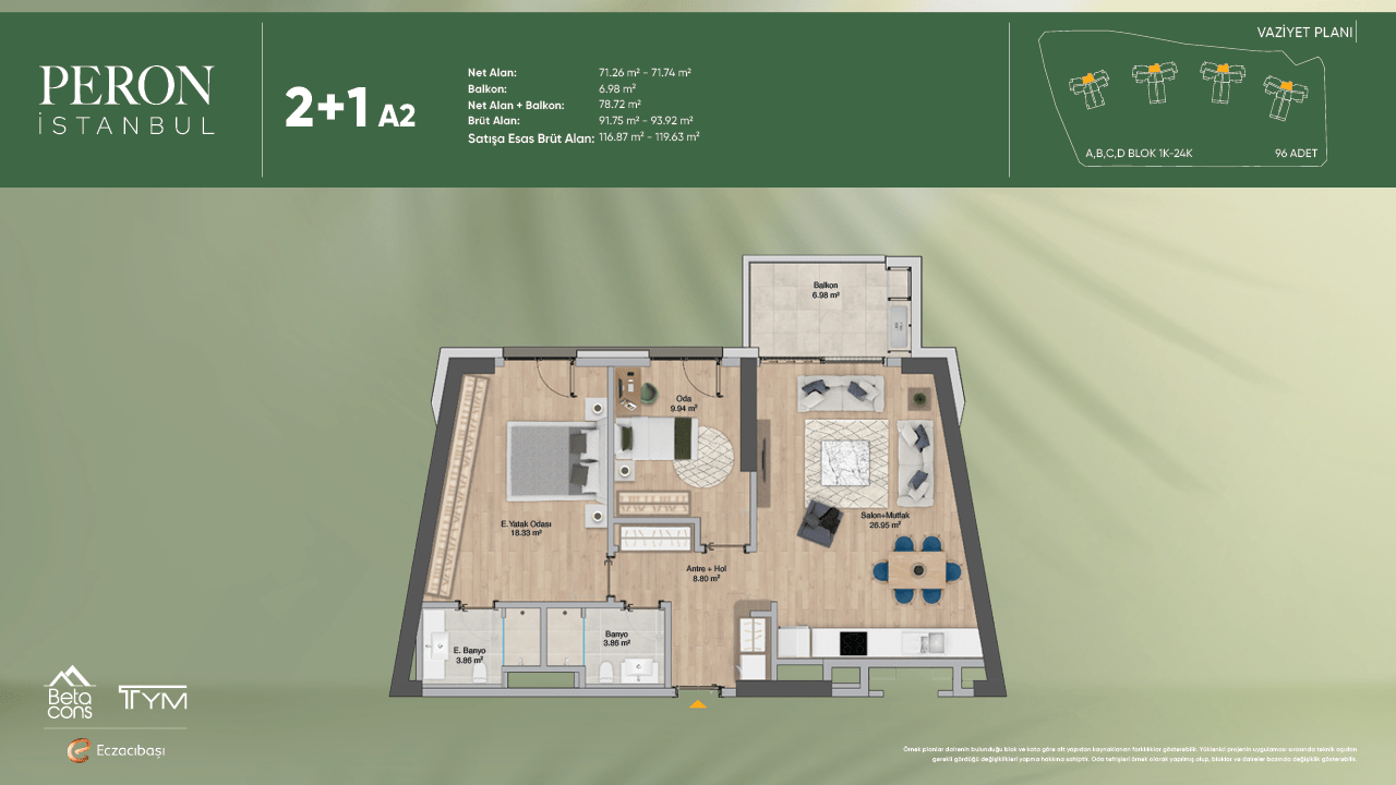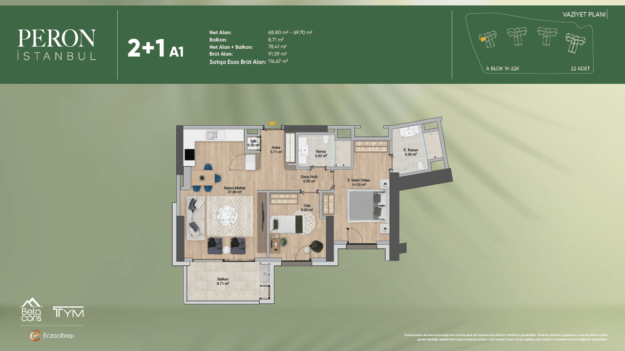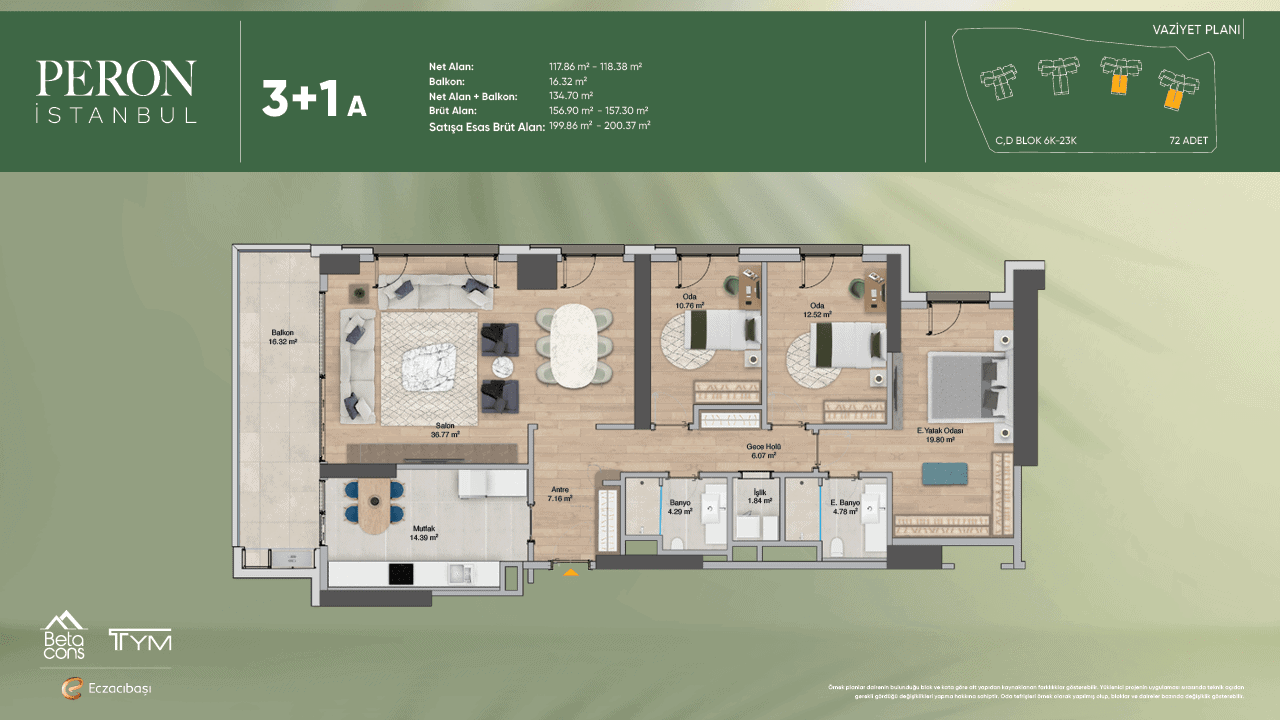 Peron İstanbul’un özenle kurgulanan vaziyet planı; A, B, C ve D konut bloklarının geniş peyzaj alanlarıyla bütünleştiği, ferah, akışkan ve dengeli bir yaşam düzeni sunan modern bir yerleşim anlayışına sahiptir. Toplam 666 konuttan oluşan projede; 2+1’den 4+1’e uzanan daire seçenekleri ve özel tip konutlar, farklı yaşam tarzlarına uyum sağlayacak şekilde tasarlanmıştır. Bloklar arası perspektifler, yürüyüş yolları ve sosyal alanlar ise modern şehir yaşamının konforunu doğayla buluşturarak sakinlerine bütüncül ve keyifli bir yaşam deneyimi sunar.
