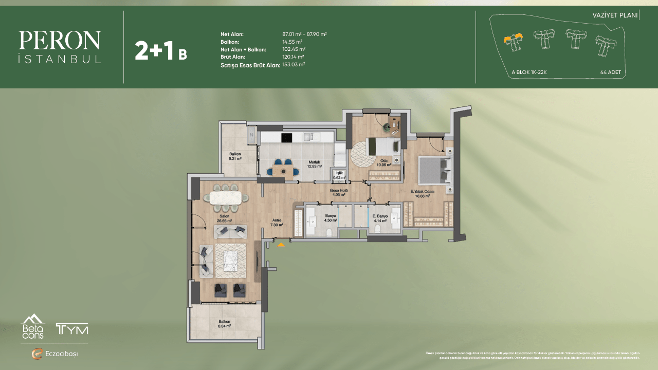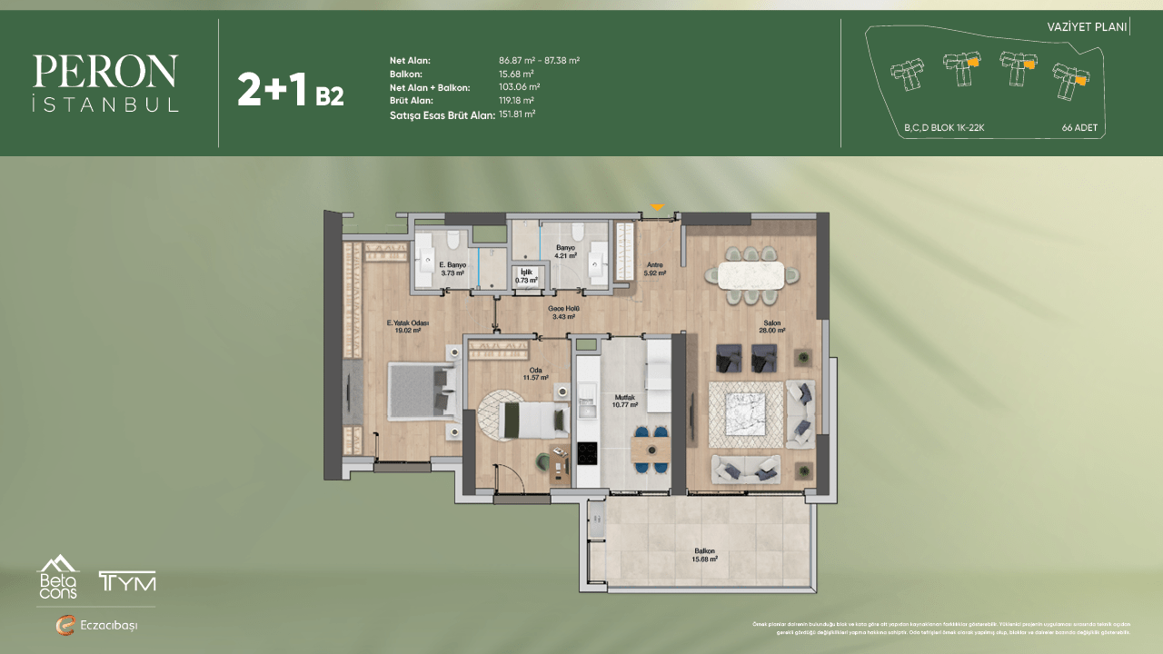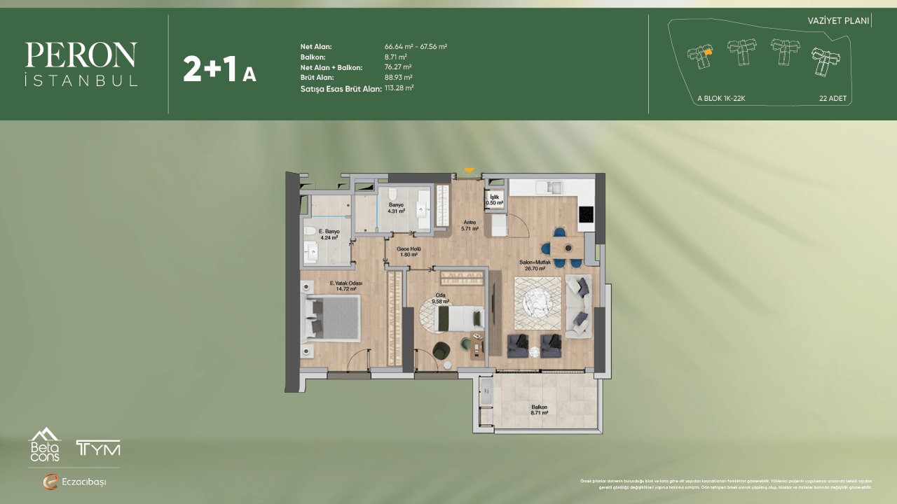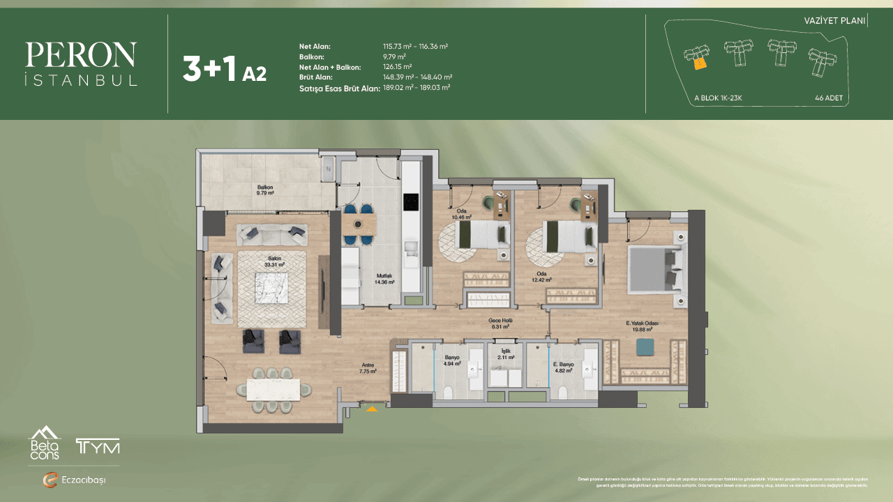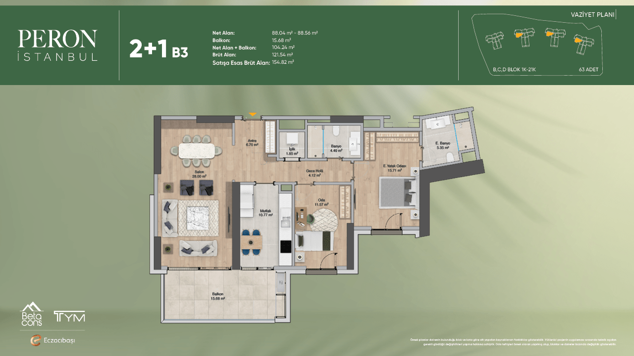 Peron İstanbul’un özenle kurgulanan vaziyet planı; A, B, C ve D konut bloklarının geniş peyzaj alanlarıyla bütünleştiği, ferah, akışkan ve dengeli bir yaşam düzeni sunan modern bir yerleşim anlayışına sahiptir. Toplam 666 konuttan oluşan projede; 2+1’den 4+1’e uzanan daire seçenekleri ve özel tip konutlar, farklı yaşam tarzlarına uyum sağlayacak şekilde tasarlanmıştır. Bloklar arası perspektifler, yürüyüş yolları ve sosyal alanlar ise modern şehir yaşamının konforunu doğayla buluşturarak sakinlerine bütüncül ve keyifli bir yaşam deneyimi sunar.